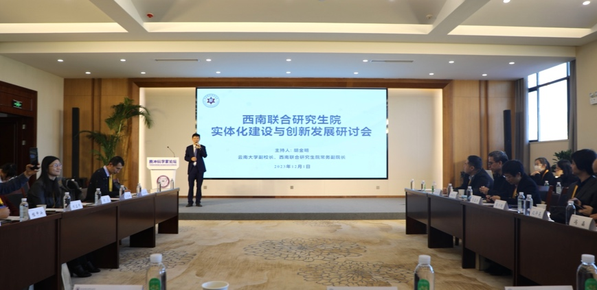 云南大学副校长、西南联合研究生院常务副院长胡金明分别从西南联合研究生院2023年大事记、实体化建设、师资队伍建设、招生与培养、科学研究、基本运行保障六方面介绍西南联合研究生院实体化建设2023年度进展及发展规划。