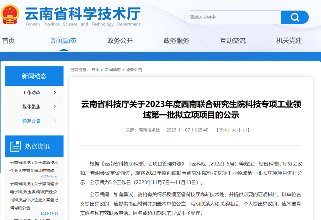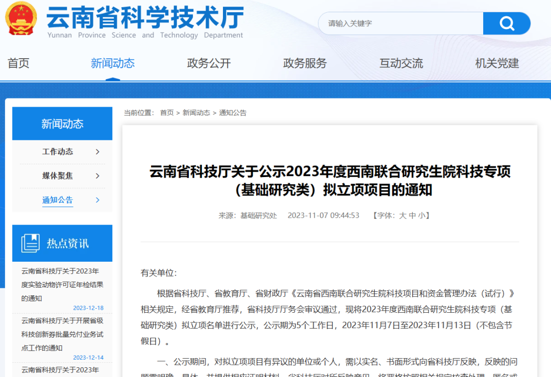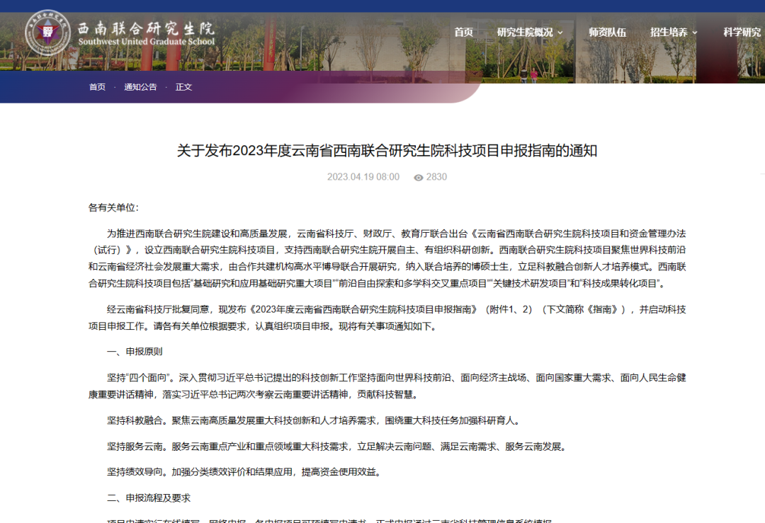 实现首批项目落地。在省科技厅、省教育厅指导下,发布2023年度云南省西南联合研究生院科技项目申报指南,围绕优势特色学科,聚焦云南省特色生物资源和矿产资源等开发利用与产业发展、大健康产业发展、生物多样性保护与生态环境治理、高原特色农业发展等领域,组织省内外导师联合申报项目,以项目为依托加强导师合作,联合开展科技创新和研究生培养。2023年11月,首批云南省西南联合研究生院科技项目基础研究类23项、工业领域4项完成立项公示。