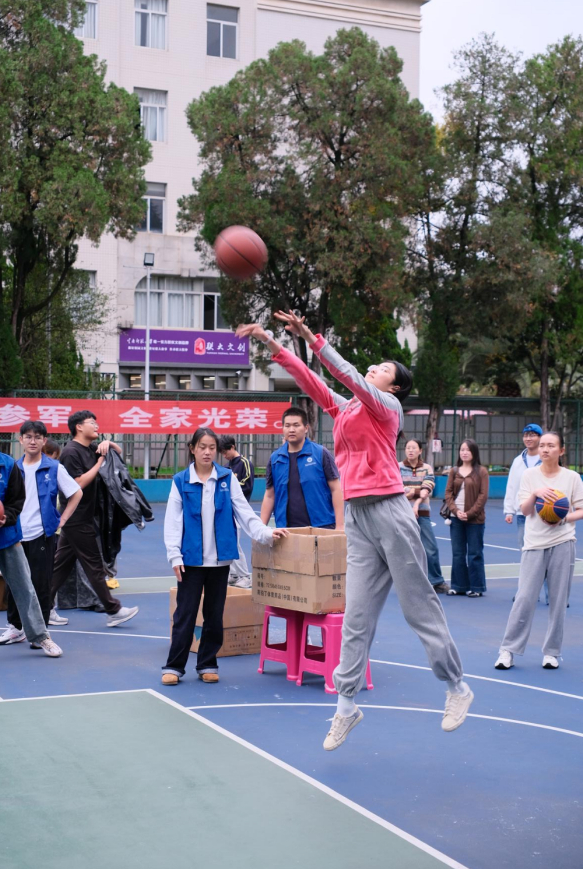 赛场外,协调组保障赛事顺畅推进,现场工作组细致服务,裁判团队公正执裁,宣传组实时记录精彩瞬间,共同为篮球赛保驾护航。